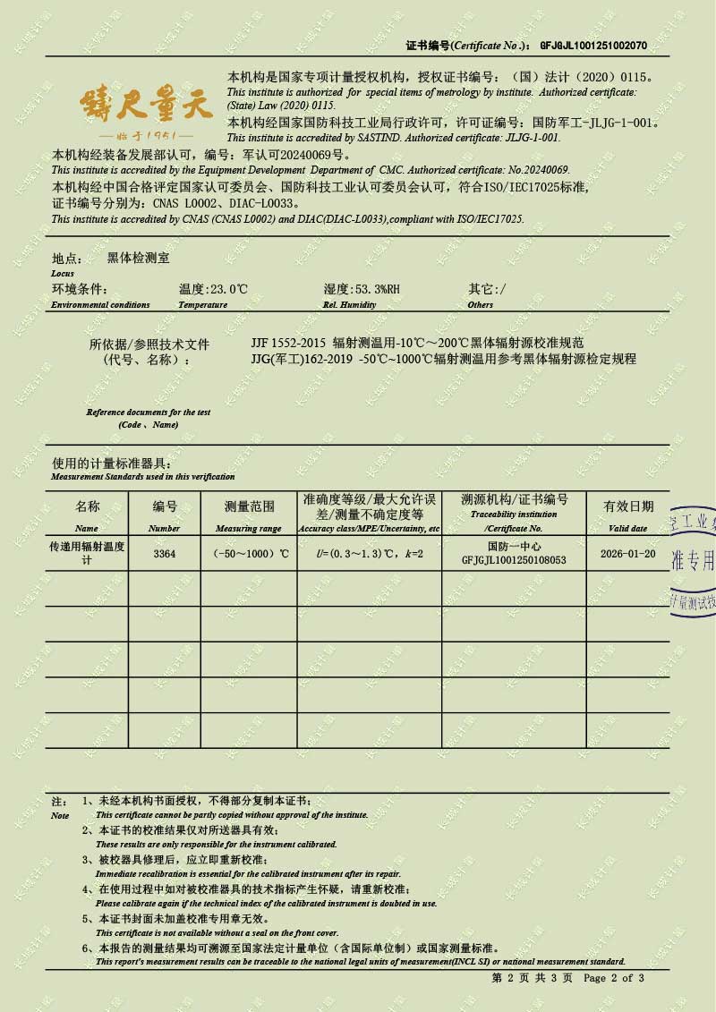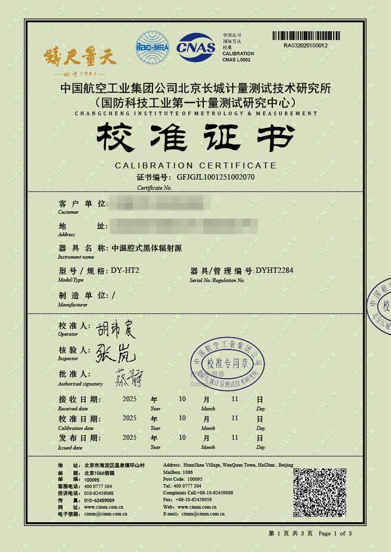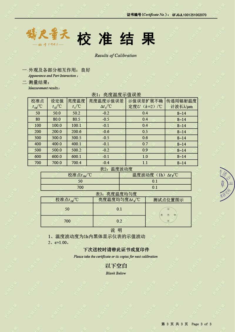 | 上一條:高溫腔式黑體輻射源(700-1600℃)校準(zhǔn)證書 | 下一條:便攜式溫濕度檢定箱(-10-60℃)校準(zhǔn)證書 |