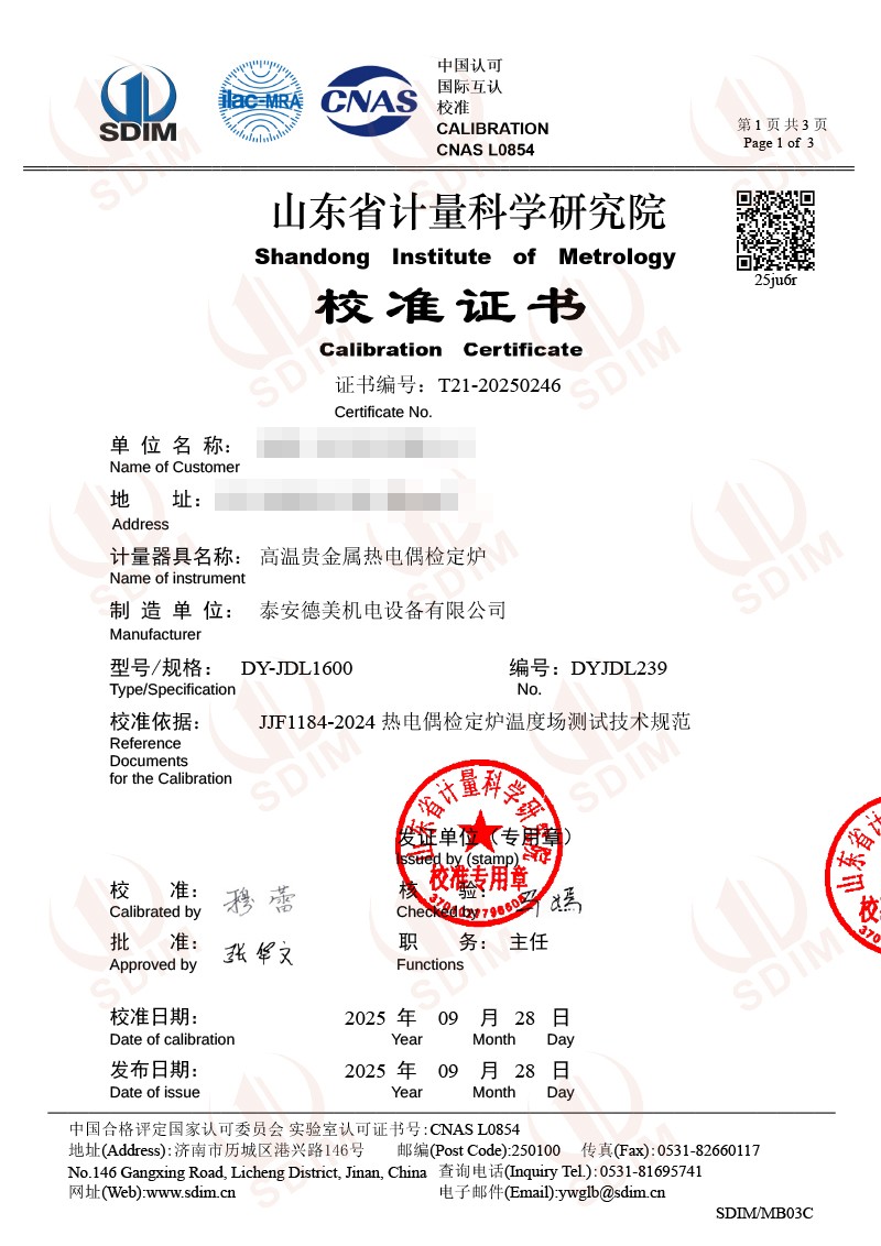高溫貴金屬熱電偶檢定爐(800-1600℃)校準證書 2025-10-14 本文被閱讀 512 次