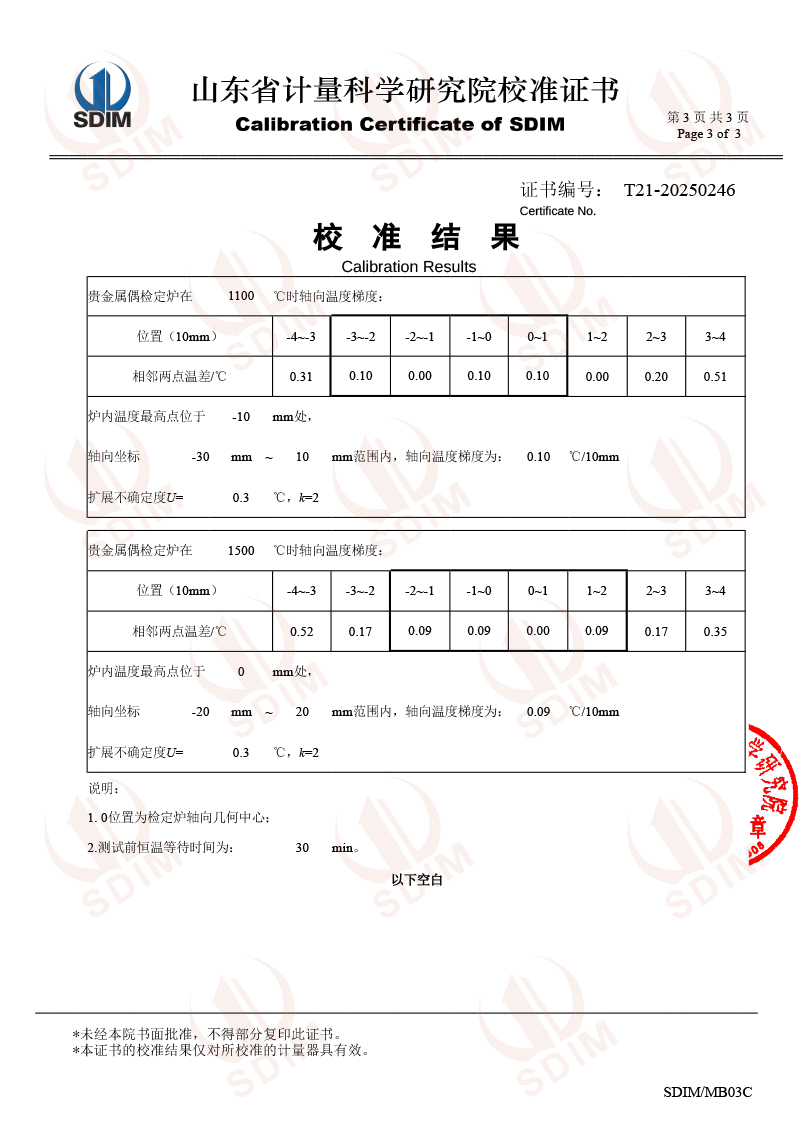 高溫貴金屬熱電偶檢定爐(800-1600℃)校準證書