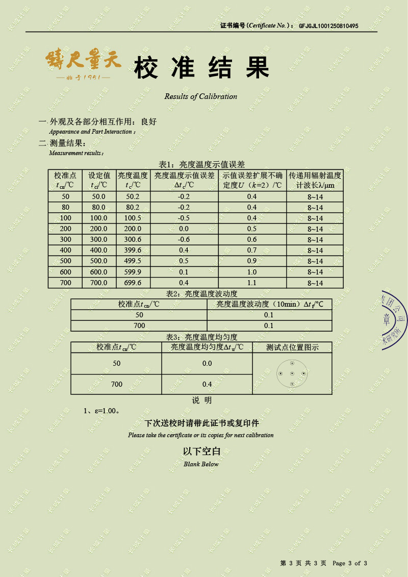 腔式黑體輻射源(50-700℃)校準證書 2025-9-3 本文被閱讀 1432 次